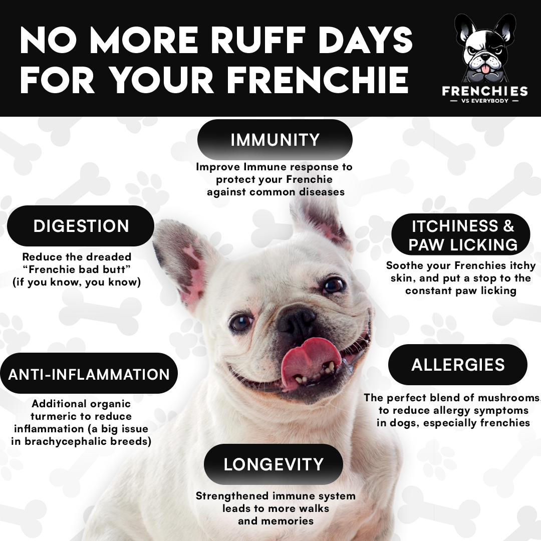 - Frenchies vs........ paw licking, allergies, itchiness, diarrhea, digestion and gut health issues, respiratory issues, liver problems, etc! "Frenchies vs Mushrooms" is here to help with all that & more by boosting your frenchies immune system!
